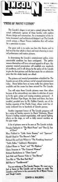 About a year after the theatre opened, the silent film era began to give way to the "talkies." Many classic films opened at the Lincoln during the years, including Al Jolson's groundbreaking 1927 hit The Jazz Singer, and, in the following decade, the enormously popular films of Shirley Temple.