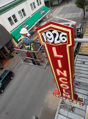 Above: Brett Milton, of Meyer Sign and Advertising Company, in May of 2011, putting on the final touches to our replicated blade sign, the original of which was destroyed in the 1980s. For the complete story of our Blade Sign Campaign (Project 85) follow this link.
